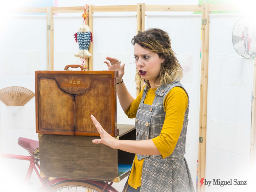 Érase una vez … un Kamishibai , que viajaba en la bicicleta especial de la muchacha que no vendía golosinas. Por él , comienza a deslizar unas láminas con unos dibujos de trazos gruesos y sencillos que interpreta y cuenta con rápidas descripciones y diálogos vivaces. Los niños y niñas escuchan cuentos que han dado la vuelta al mundo, miran boquiabiertos, gritan aterrados, o ríen a pleno pulmón.