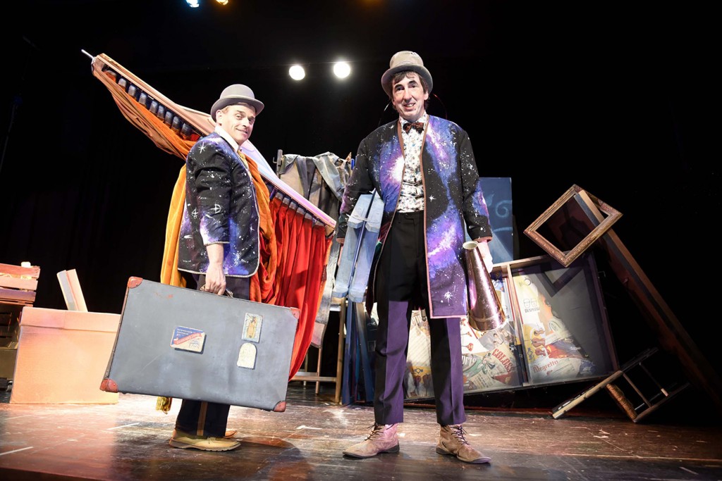 Dos viajeros infatigables, extraños y extravagantes, llegan al escenario programados para hacer reír. Como dos hombres orquesta, nos ofrecen sus mejores habilidades: música imposible, hacen teatro reciclásico y hasta nos avanzan el futuro en vivo y en directo.