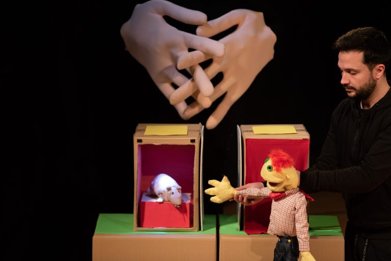 familia que combina títeres con manipulación a la vista, actores y media máscara.