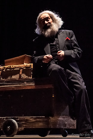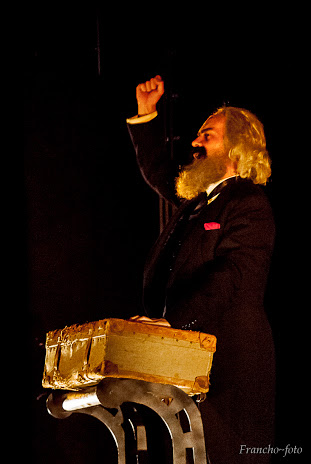 - Adaptación:En estos tiempos de zozobra social y económica, cuando todas las mañanas nos desayunamos con la crisis, cuando todos los días hay un político, un tecnócrata, un economista diciendo lo mal que van las cosas y las dolorosas cosas que hay que hacer para que no vayan peor, pero van; en estos tiempos de abatimiento general nos proponemos reclamar a Marx, a Carlos Marx, el denostado, el vilipendiado, el rematado, para volverlo a la vida y que nos cuente, modesta, sinceramente, lo que piensa sobre las cosas.