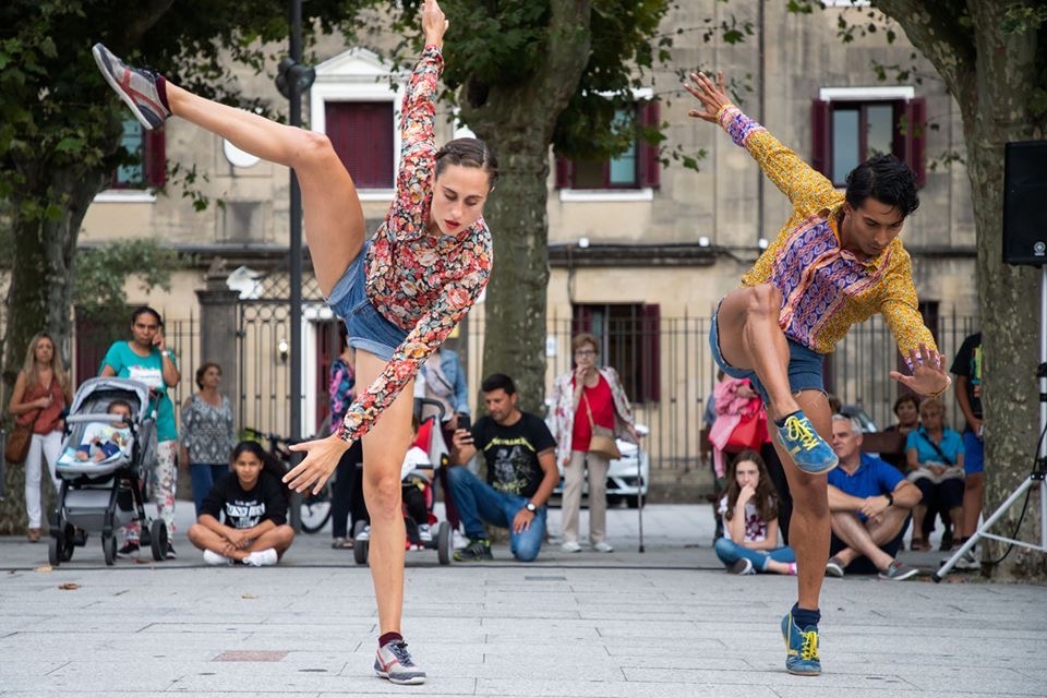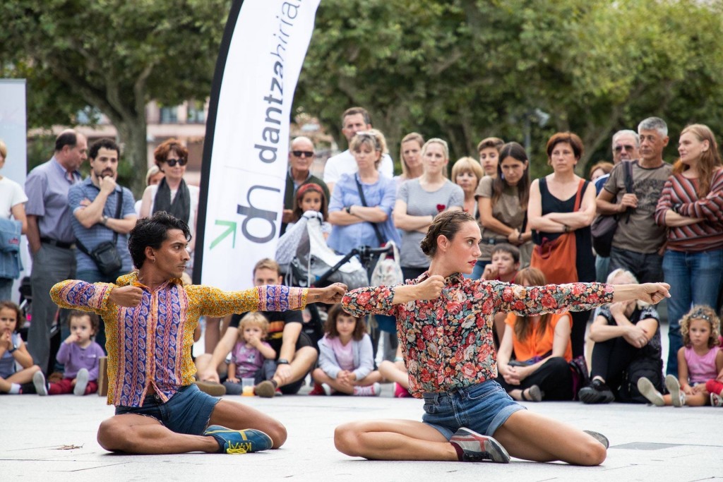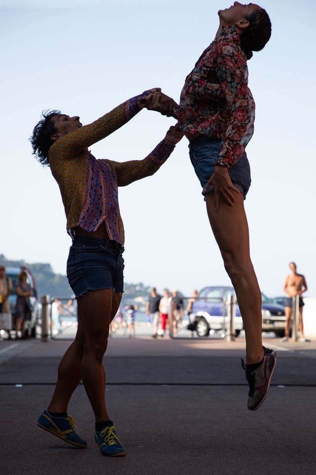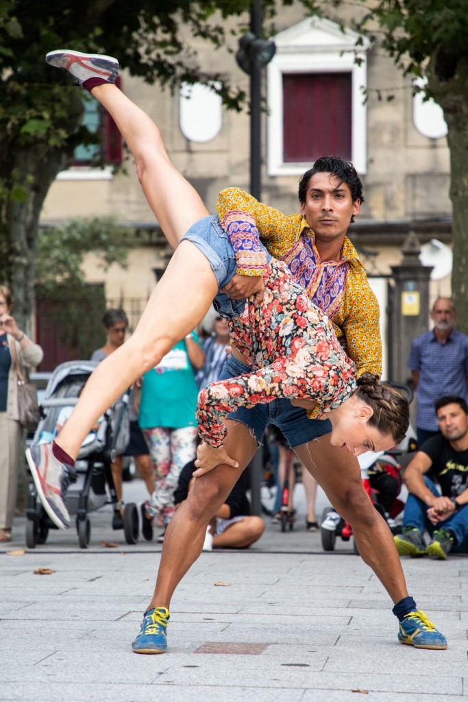 OUT OF THE BLUE es una pieza de danza contemporánea de formato pequeño pensada para mostrarse en calle donde dos intérpretes se encuentran en escena. Es un trabajo fresco y divertido que nace de la necesidad de disfrutar del placer de bailar libremente, de moverse, de desconectar, de romper con lo rutinario y lo ya establecido. Tanto es así, que nuestra propuesta es mostrar la pieza al publico para que éste disfrute tanto como nosotros. Queremos que sonría, que aplauda y que sienta el ritmo de la excitación a la que conduce la pieza.