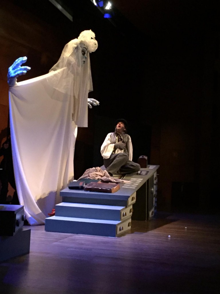 Montaje teatral de actores en interacción con títeres y diferentes técnicas de manipulación.
