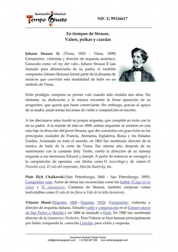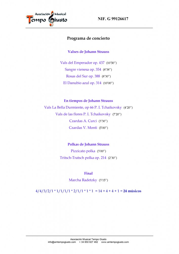 - Adaptación:Programa de conciertoValses de Johann StraussVals del Emperador op. 437Sangre vienesa op. 354Rosas del Sur op. 388El Danubio azul op. 314En tiempos de Johann StraussVals La Bella Durmiente, op 66 P.I. TchaikovskyVals de las flores P.I. TchaikovskyCzardas C. CurciCzardas V. MontiPolkas de Johann StraussPizzicato polcaTritsch-Tratsch polkaFinalMarcha Radetzky