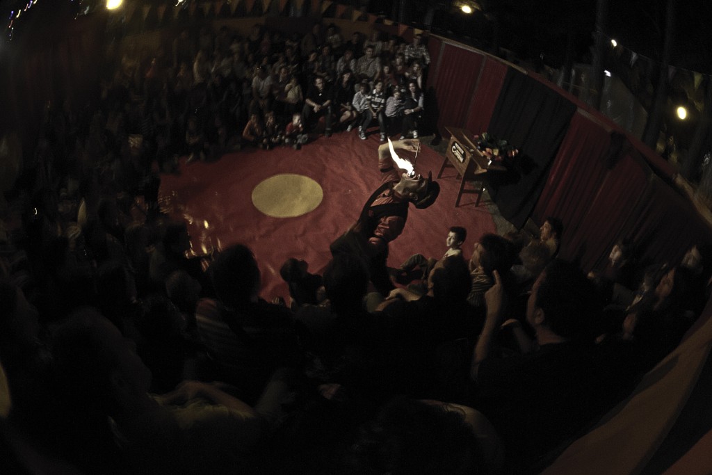 La “Carpa Mágica” es un espacio íntimo, cerrado perimetralmente con lona, con gradas de madera a tres alturas, donde una centena de espectadores podrán disfrutar, en vivo y en directo, de un espectáculo a la antigua usanza, lleno de picaresca y engaño.