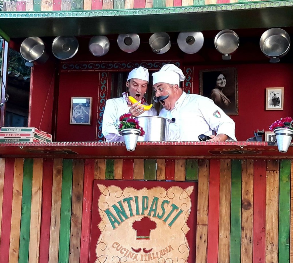 Números de magia con comida, bebida, fuego… Malabares con todo lo que se pueda encontrar en una cocina… Participación del público… Vespas, spaguetti y la mejor música italana.