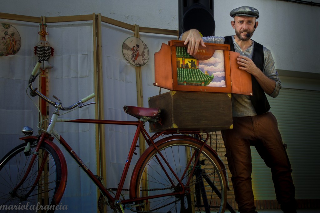 Érase una vez … un Kamishibai , que viajaba en la bicicleta especial de la muchacha que no vendía golosinas. Por él , comienza a deslizar unas láminas con unos dibujos de trazos gruesos y sencillos que interpreta y cuenta con rápidas descripciones y diálogos vivaces. Los niños y niñas escuchan cuentos que han dado la vuelta al mundo, miran boquiabiertos, gritan aterrados, o ríen a pleno pulmón.