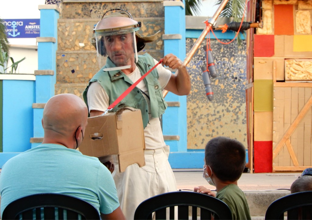 Espectáculo de teatro de calle en clave de clown para todos los públicos. Obra muy divertida, poética y entrañable, con la complicada tarea de enfrentarse al tema de la guerra y su tragedia a través del humor.