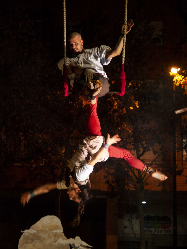 Aparecen la gente del pueblo cantando un romance a la luna… poco a poco dudan de una chica del pueblo, que acusarán de bruja, se subirá a una escoba, trapecio donde intentará huir por encima de los mallos.
