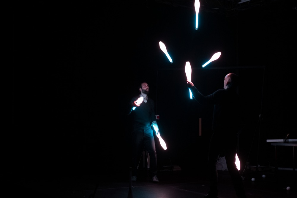 Movimientos hipnóticos de los malabares con tubos imantados, pelotas, diábolos y mazas de luz programadas al milisegundo forman un espectáculo basado en las leyes de la física llevado a cabo por dos ingenieros con casi veinte años de trayectoria escénica. Física y circo se funden con el humor para poner en escena RUBE.