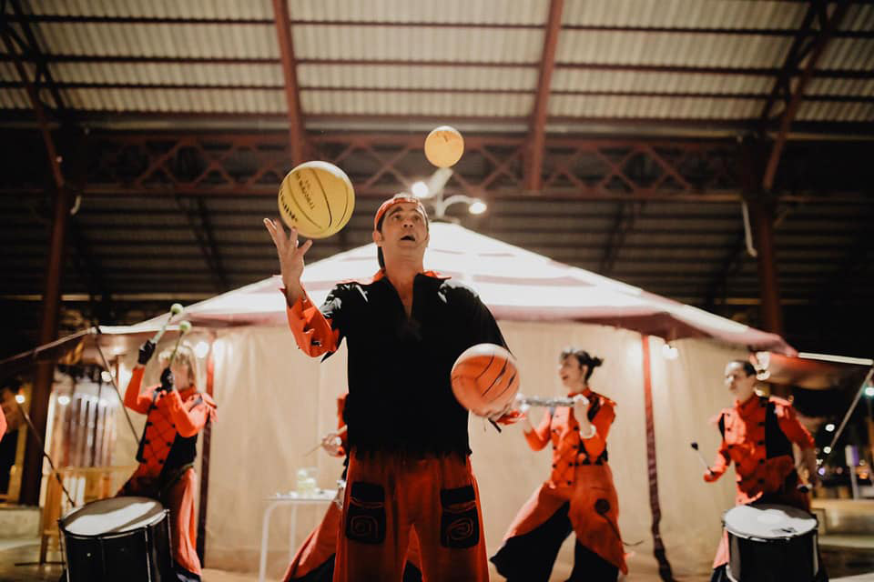 Todos los personajes y sus skets cómicos circenses, acompañados por la mejor percusión y sus frenéticos ritmos en directo, que con su original puesta en escena mantendrán una conexión con el público en todo momento.