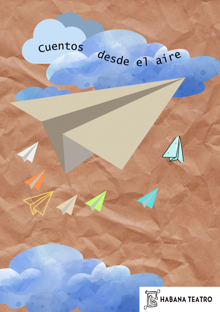 Los cuenteros – teatreros, entre canciones y juegos reparten aviones de papel entre algunos espectadores del Teatro o de la Biblioteca. Los niños siguiendo el canto lanzan sus aviones de papel, donde están escritos sus sueños en forma de cuentos. Aviones de todos los colores aterrizan en el escenario, y con ellos aterrizan los cuentos. Los narradores al azar van descubriendo y contando el cuento que nos trae cada avión. Cada vez que un avión de papel surca el aire, nos trae un cuento diferente para compartir con los espectadores. Cada vez que un niño o una niña, escriba un cuento y después convierta ese hoja de papel en un avión y lo lance a las nubes, y lo haga volar por el mundo hará que otros niños y niñas de todo el planeta descubran cuentos que vienen desde el aire.