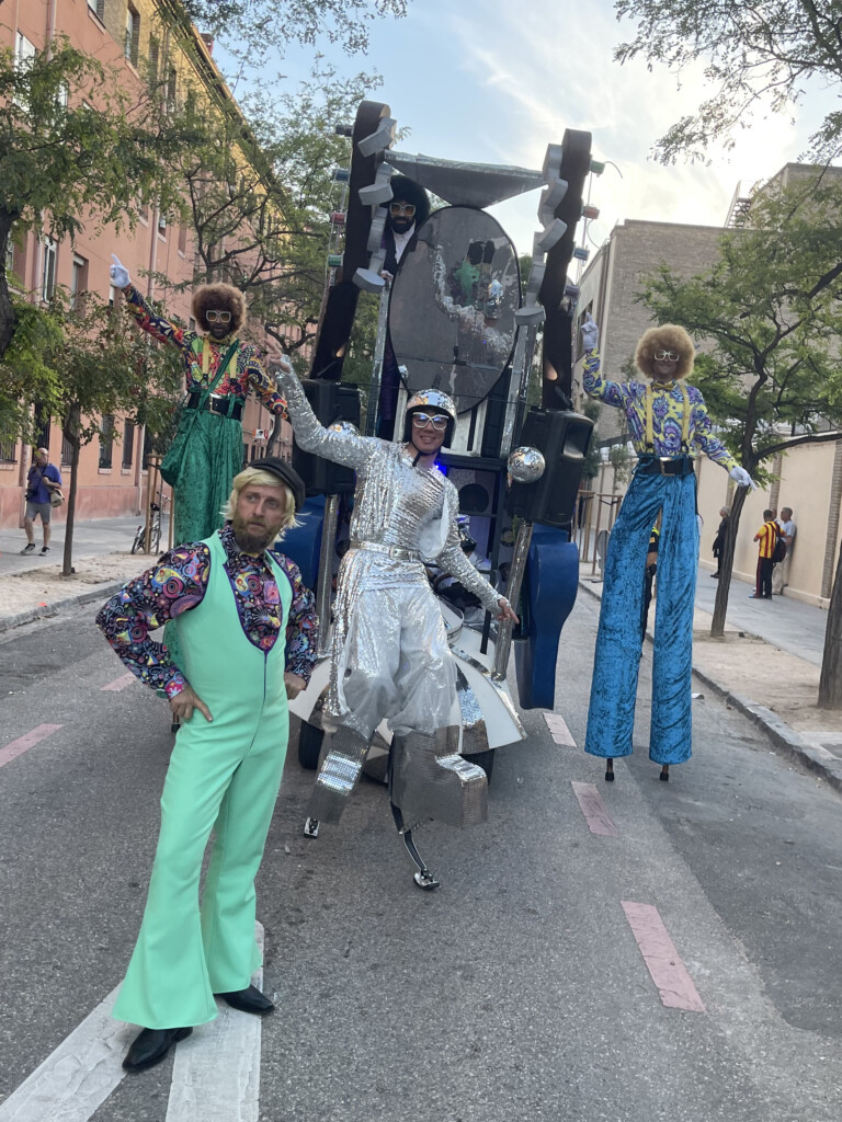 Personajes sesenteros y setenteros con un outfit de la época (colores estridentes, pelos afro, pantalones de campana, monos), a ritmo de música FUNKY, sobre zancos, zancos de bote, a pie de suelo y sobre el mini-escenario del vehículo eléctrico coronado por dos bajos gigantes (instrumento fundamental de la música funk) y una bola de espejos “discotequera”.