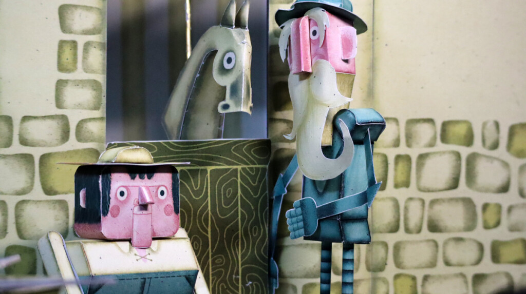 Don Quijote nómada es un espectáculo de títeres y cine en directo. En este proyecto fusionamos lo artesanal y analógico de nuestra infancia con las nuevas herramientas de comunicación, permitiendo el abrazo de la poética tradicional con la poética tecnológica.