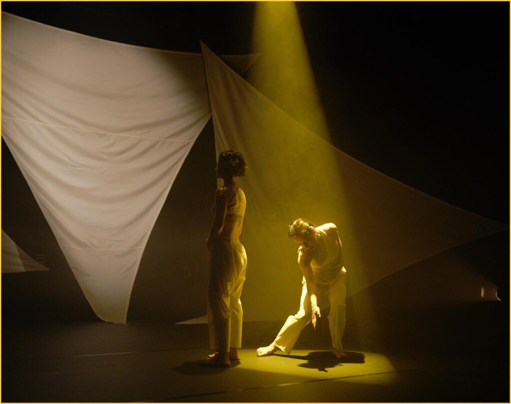 En este espacio tiempo singular, encontramos dos cuerpos atraídos hacia el otro, conviviendo, afectándose, fusionándose… En un ambiente que pasa de lo etéreo e intangible, a lo más terrenal y consciente. Los dos cuerpos van dejando una estela, un trazo de movimientos que sugieren un sinfín de sensaciones… A veces conviviendo en un mismo mundo que los envuelve, otras, ganando el mundo interior personal.