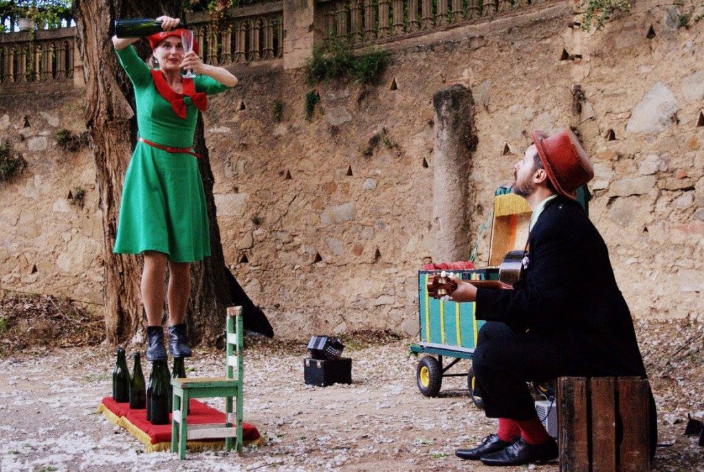 Dos personajes clown y un baúl circulan por el paisaje urbano buscando el lugar ideal para crear la ilusión de un imposible: andar sobre botellas.