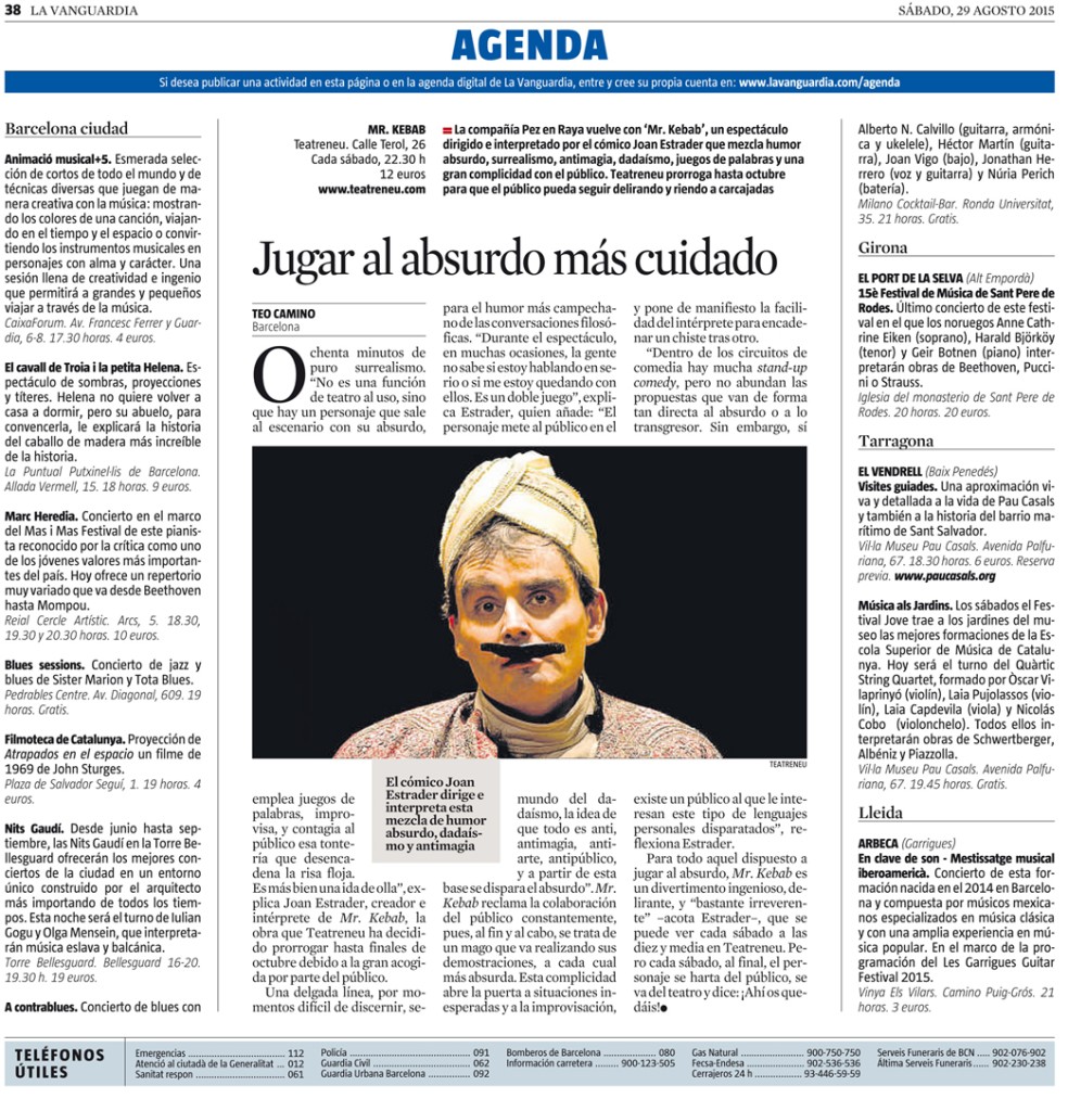 Para todo aquel dispuesto a jugar al absurdo, Mr. Kebab es un divertimento delirante, donde al final, el personaje se harta del público, se va del teatro y dice: ¡Ahí os quedáis!