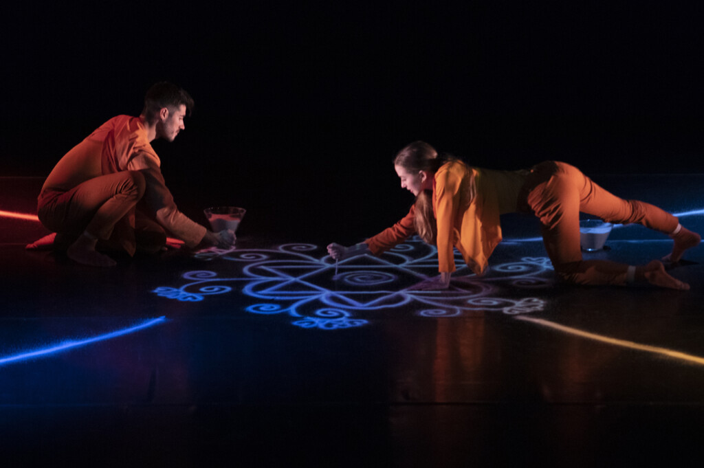 Dos amigos se encuentran y cantan van a jugar dibujando en el suelo un universo que va tomando forma con líneas de sal que trazan con sus manos. Casi sin darse cuenta, el dibujo y el juego se une al movimiento de sus cuerpos completando y desdibujando su efímera obra. Es parte del disfrute que produce sentirse unidos al hacer y deshacer. Todo el espacio tiene la capacidad de convertirse en cualquier cosa y ellos pueden hacerlo, guiados por la danza.