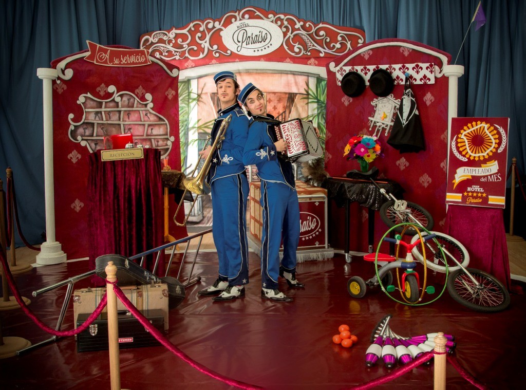 “A su servicio” es un espectáculo familiar, donde el humor, el circo y la magía complementan a estos dos singulares personajes. El Gran Hotel Paraiso, es un hotel venido a menos, fue referente de glamour y lujo en su época dorada, pero hoy en día solo le quedan dos trabajadores, Birly & Biloque, dos personajes que tratarán que todo siga como antaño; para ello serán los botones, camareros, cocineros…se subirán en escaleras y monociclos imposibles, harán apariciones y desapariciones mágicas, malabares peculiares, levitarán a alguno de los clientes, música en directo… y con todo esto, quizá este año si, lleguen a ser “Los empleados del mes”.