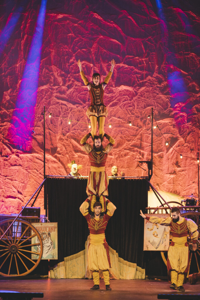 Artistas y músicos montan y preparan en directo toda la escenografía para la función. El circo es una gran familia en la que conviven juntos, comen juntos, duermen juntos… se enamoran, discuten, bailan, juegan, se pelean… …juntos.
