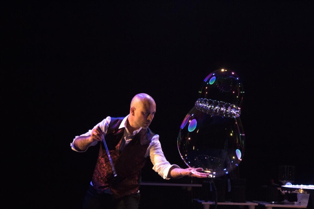 Bubbles show es un espectáculo familiar, participativo y sorprendente, donde el artista busca los límites y las posibilidades de las burbujas con vapor, helio, humo, fuego, música…Para saborear la magia de las pompas y toda su seducción.