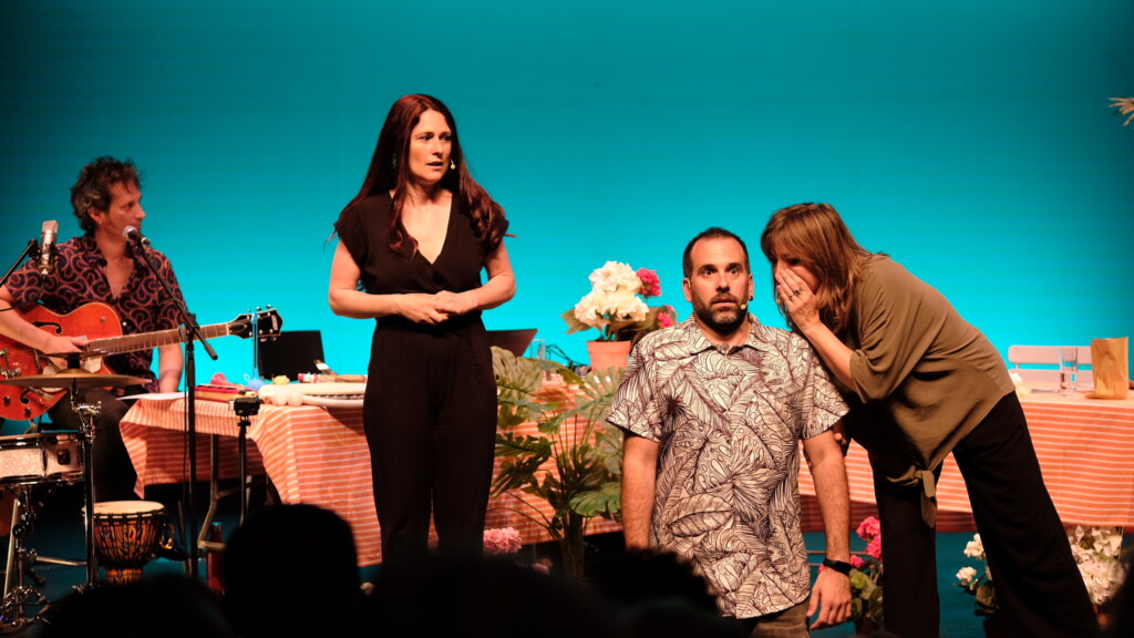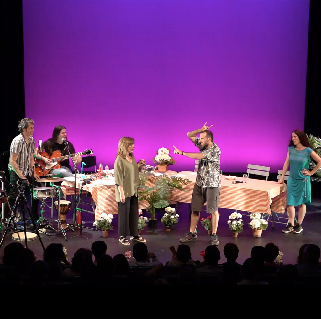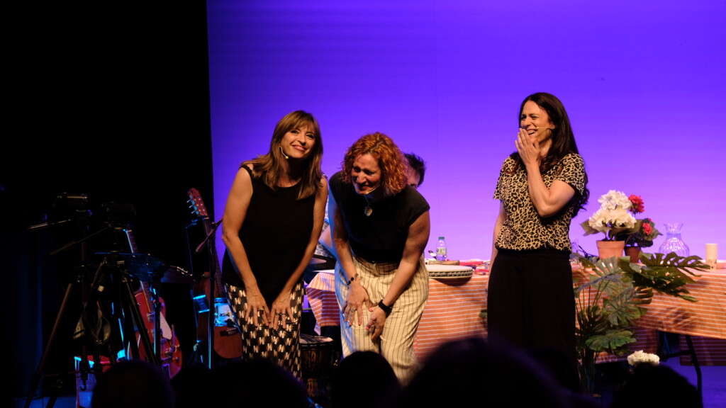 A nuestro divertidísimo patio acude un invitado o invitada con el/la que se conversa sobre su vida, su madre (o alguna de las mujeres importantes de su vida), sus anécdotas, etc. Y probamos juntos la comida que nos traiga, algún plato característico suyo, de su familia o del lugar donde vive. Todo eso es el material a partir del cual improvisamos, dialogamos, cantamos y nos reímos, tanto nosotros como el público que nos acompaña, cómplice y parte fundamental de nuestro espectáculo.