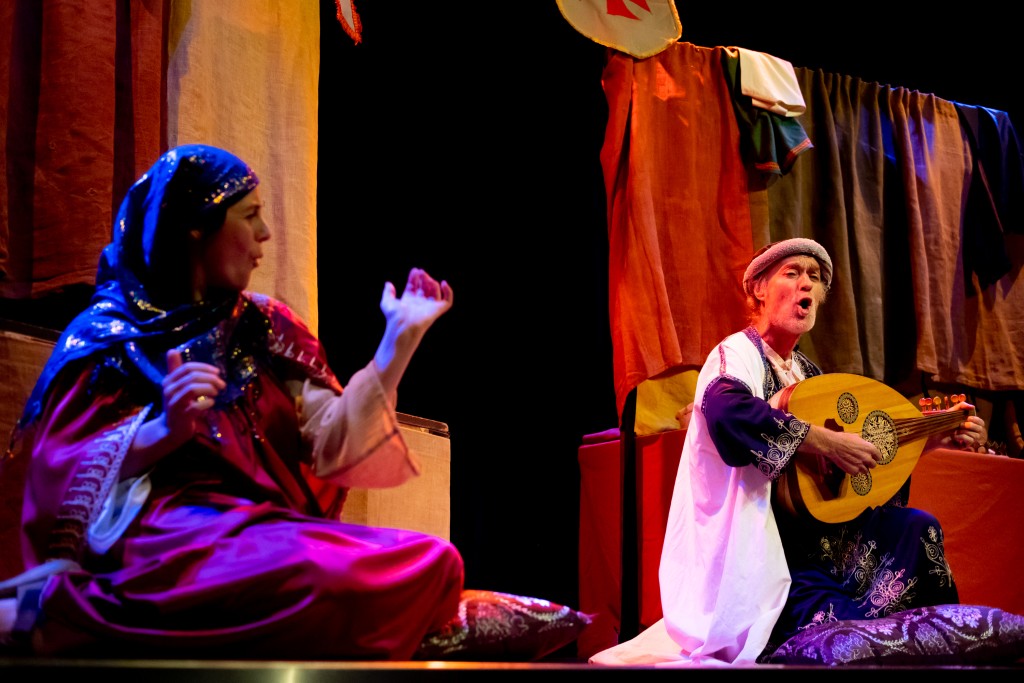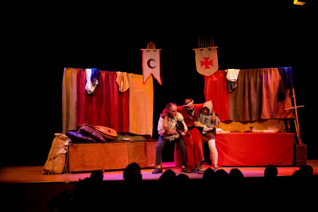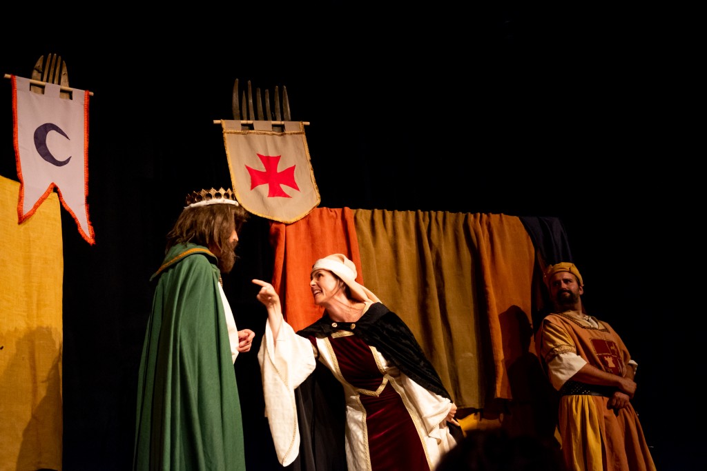 Pero no son épocas de vacas gordas, menos aún para los comediantes… Y la comparsa juglaresca no puede contratar al gran número de actores, músicos, bailarinas, luchadores y extras que sería necesario, pues han de pagar suculentas cantidades en concepto de comisiones a la ETT que les contrata, fianzas, permisos, tasas… Así que tres tristes juglares tienen que multiplicarse para narrar y representar todos los ilustres hechos y los nobles personajes de esta gran historia. Además de tocar, cantar…
