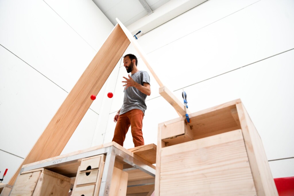 Edu pone en escena una propuesta que cautiva desde el comienzo con una depurada técnica e investigación con los malabares que se mezcla con la tecnología, con una escenografía llena de sorpresas y una cuidada puesta en escena.