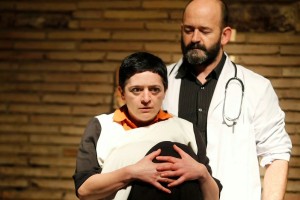 Mamá Gallina. Una mujer en su semana 1000 de gestación se debate entre dar a luz o seguir protegiendo a su hijo, mientras un otorrino le resuelve en una consulta improvisada la revisión periódica de su largo embarazo.