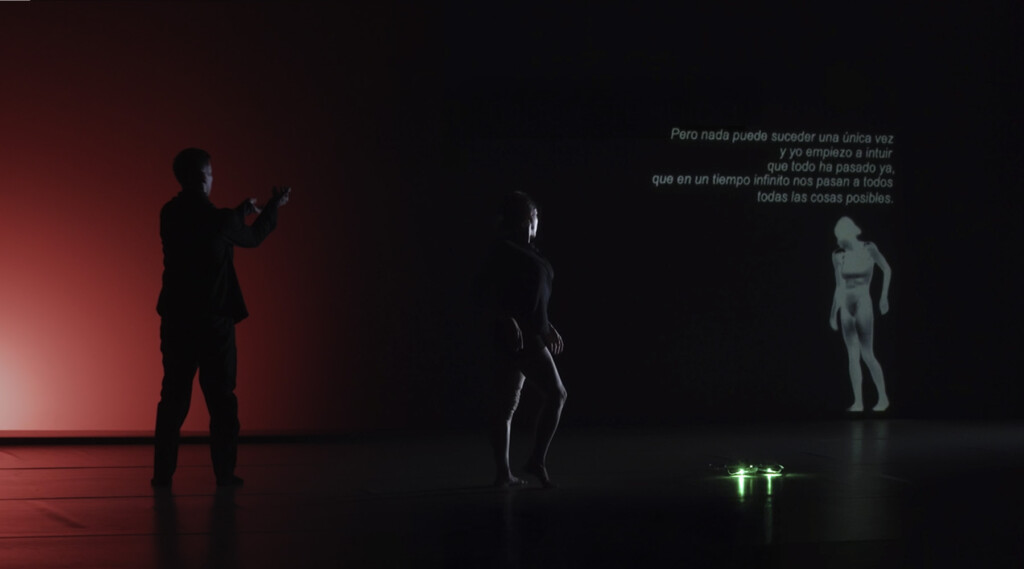 En esta obra, dos cuerpos saltan de imagen en imagen como en una sucesión de frames, se entrelazan, solapan y orbitan creando imágenes de gran carga poética moviéndose entre la penumbra y la luz, entre el espacio físico y las imágenes de la pantalla en compañía de un dron, un ser virtual que es a veces un animal doméstico y otras un satélite inerte o la personificación de la vida eterna que la tecnología nos promete. En un espacio vacío, una tábula rasa donde todo puede suceder, el movimiento de los cuerpos, como en la bóveda celeste, dibuja la historia del tiempo. TODO ESTE RUIDO es un canto a la luz que atraviesa el cosmos para darnos forma.