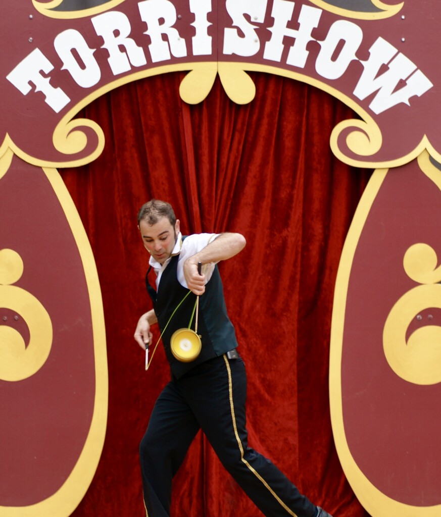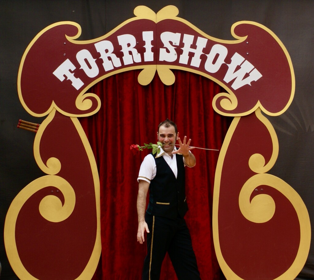 Dándolo todo con su gran número “Malabártulos”, donde mezcla malabares y equilibrios con gran destreza, hará partícipe al público e incluso conseguirá que alguien del respetable se convierta en una súper estrella del Torri Show, ayudándole a realizar el gran final de los “Malabártulos”.
