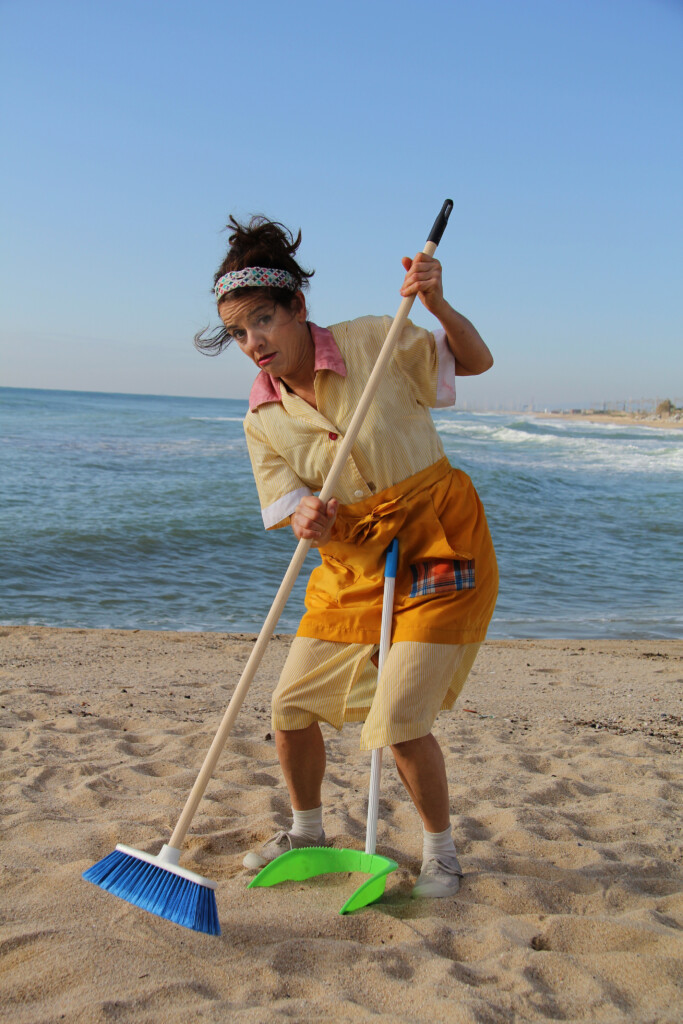 Una mujer de la brigada de limpieza es la encargada de acondicionar el escenario.