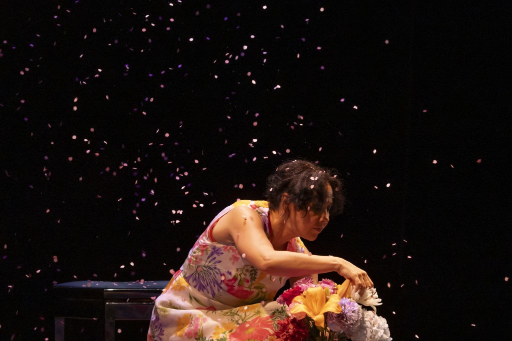 La pieza está inspirada en los cuadros de Emilia Román de 95 años, madre de Patricia Ruz, y en el descubrimiento que ella hizo de su conexión con las flores. Estos cuadros son fruto de sus encuentros y la relación que establecieron a través de la pintura como manera de comunicarse.