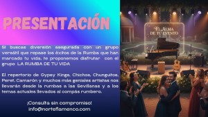 LA RUMBA DE TU VIDA es un grupo aragonés con dilatada experiencia formado por artistas que hacen que el evento sea un deleite para los sentidos y no puedas parar de palmear y bailar .