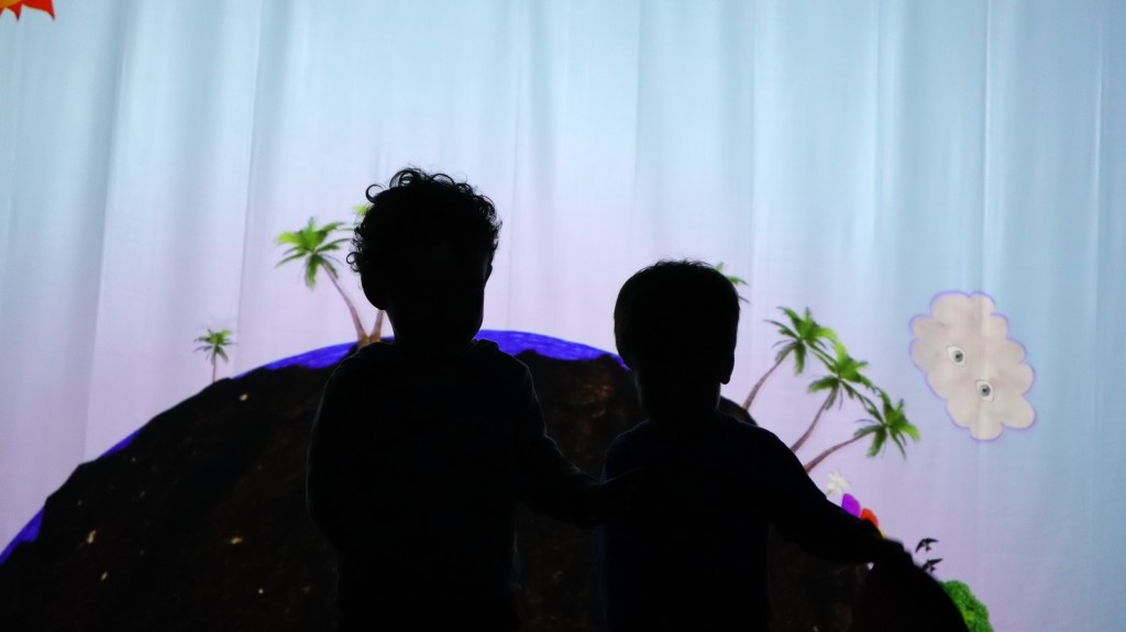 La pantalla en medio del espacio escénico crea una experiencia fascinante, donde el público se mueve libremente por el espacio escénico, por un lado, invita a contemplar e interactuar con sonido y palabra y del otro crea un universo gigante lleno de sombras.