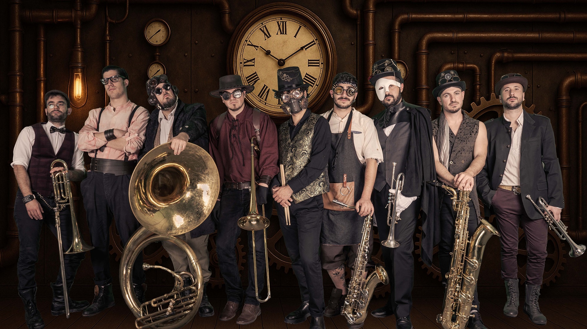 Somos una brass band de estética steampunk que transforma los grandes hits contemporáneos en potentes arreglos para viento y percusión, inspirados en las legendarias bandas de Nueva Orleans. Nuestras máquinas de vapor musicales combinan lo clásico y lo moderno en un universo retrofuturista con alma victoriana.